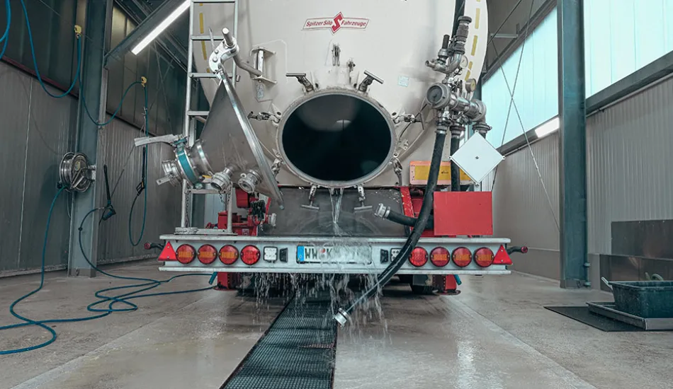 Wir sind uns dieser Verantwortung voll bewusst und besitzen daher eine hauseigene Siloinnenreinigungs- und -trocknungsanlage, in der auch Fremdfahrzeuge nach jedem Materialwechsel gereinigt werden können.
